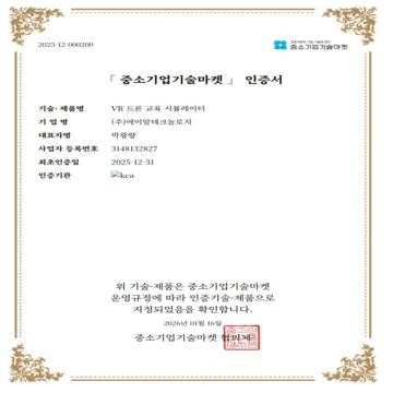 중소기업기술마켓 인증기술(제품) 지정(VR 드론 교육 시뮬레이터)
